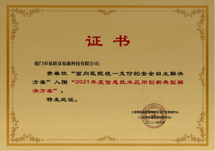 在“2022新一代信息技术融合应用创新云峰会”上,易联众集团旗下易惠科技公司的“面向医院统一支付的安全自主解决方案”以其先进的技术创新能力与显著的应用示范成效成功入选“2021年度信息技术应用创新典型解决方案”。该方案融合银联、支付宝、微信、数字人民币、商保等多种支付渠道,为医院HIS系统、自助服务系统、掌上医院APP、微信公众号、支付宝服务窗、网站等其他各类涉及预交金充值、门诊缴费、门诊结算的系统提供一体化且自主安全的支付应用解决方案。易联众统一支付平台以自主安全为前提,最大限度克服医院就医的“三长一短”问题,极大地优化了就医流程,不仅让患者切实感受到了“互联网+健康”创新成果带来的实惠,也充分提升了财务人员的工作效率,得到了医、护、患多方的一致肯定。目前该解决方案已在北京、安徽、山东、福建等十余个省级行政区广泛应用,覆盖全国500多家医疗服务机构。