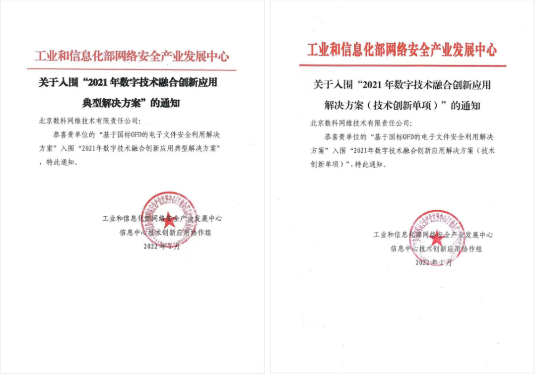 在2021年信息技术应用创新解决方案征集工作中,数科网维的“基于国标OFD的电子文件安全利用解决方案”经过层层筛选,成功入围2021年信息技术应用创新解决方案典型案例并荣获2021年信息技术应用创新解决方案技术创新单项奖。“基于国标OFD的电子文件安全利用解决方案”依托我国自主的OFD版式标准及相关技术,以信创安全发展为背景,为各类用户解决电子文件安全利用问题,可以应用在党政、金融、能源、交通、电信、教育等领域,与电子公文、公文交换、电子档案、电子证照、电子招投标、电子合同、电子文件综合管理等应用系统无缝集成,为电子文件的上通下达、共享交换、安全传输、安全利用提供可靠可信的技术保障。