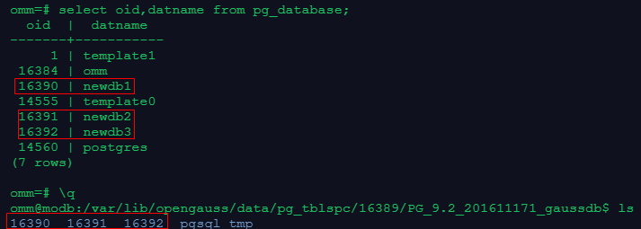 通过第一个sql我们可以查询出,数据库对应的oid,之后在实际文件系统路径中,我们能看到16390、16391和16392三个内容,对应3个数据库。