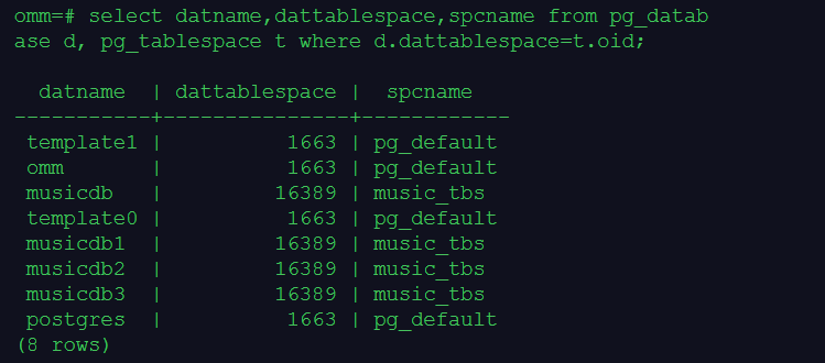 select datname,dattablespace,spcname from pg_database d, pg_tablespace t where d.dattablespace=t.oid;