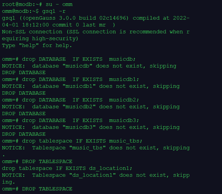 通过本次实验更加了解到了openGauss的逻辑架构,掌握了相关的表空间、数据库之间的关系,在同一个表空间中可以拥有多个相互隔离的数据库,创建数据对象时可以指定对应的表空间,如果不指定相应的表空间,相关的对象会默认保存在PG_DEFAULT空间中。数据库管理的对象可分布在多个表空间上。表空间可以存在多个,创建好之后,创建数据库对象时可以指定该对象所属的表空间