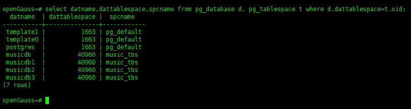 - 查看数据库所在的表空间,可以看到一个表空间可以有多个数据库