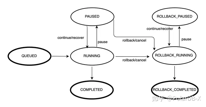 DDL开发者定义的是静态的DDL Job,然而,DDL Job在运行时,还拥有状态属性。这一属性主要由DDL引擎负责管理。当然,用户也可以执行有限的DDL运维指令以管理DDL Job的状态,实现对DDL执行过程的管理。下图是DDL Job的状态转移图,图中黑色加粗线框代表DDL Job执行的初态和终态,每个DDL Job状态之间的连线上的标注了可以执行的运维指令。