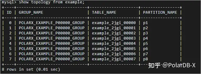 show topology from example;返回结果如下,您可以看到example数据表分布在8个分区。