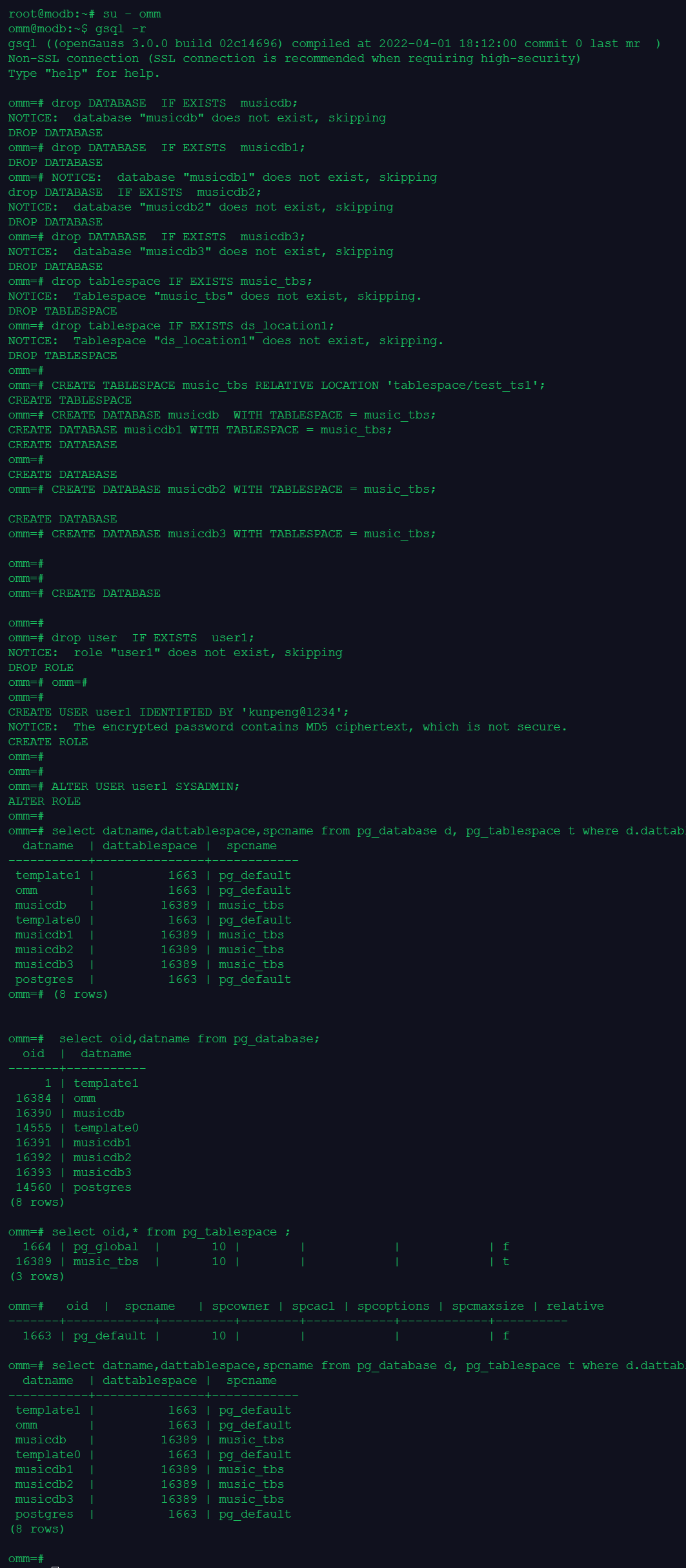 root@modb:~# su - omm omm@modb:~$ gsql -r gsql ((openGauss 3.0.0 build 02c14696) compiled at 2022-04-01 18:12:00 commit 0 last mr ) Non-SSL connection (SSL connection is recommended when requiring high-security) Type "help" for help. omm=# CREATE TABLESPACE newtbs1 RELATIVE LOCATION 'tablespace/newtbs_ts1'; CREATE TABLESPACE