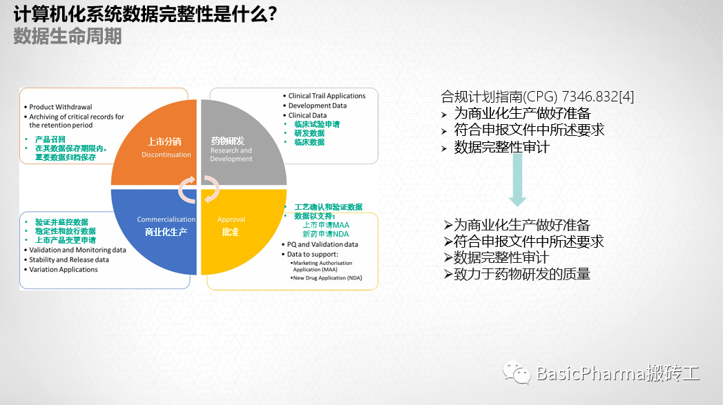数据治理和完整性将应用于整个产品生命周期()。它始于药品研发阶段,并持续到研发的早期和后期阶段。完整的GMP和DI要求将在产品分销和商业化时应用。针对数据完整性的数据治理需要在整个生命周期阶段一致地应用,并根据gmp要求的范围进行应用。需要根据药品质量体系(PQS)的要求,在药品生命周期的不同阶段,定义并系统应用基于风险的方法的全面模型。特别是,与临床、药品研发和商业化的产品/流程相比,药品研发部门对数据完整性的要求不同且不那么严格。DI的整体模型需要确保相关数据从研发和商业生命周期的所有阶段都是可用的,直到产品超过追溯期,数据可销毁为止。