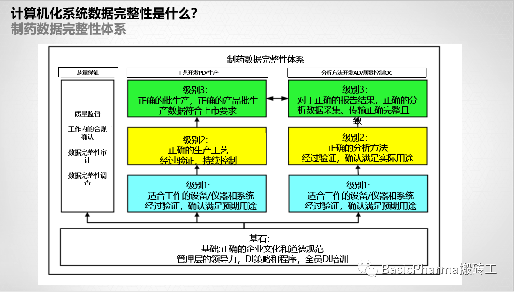 这个数据完整性模型的基础是组织中所有人(含管理层)共同参与的。这是为了确保数据完整性/数据治理在药品质量体系的背景下得到牢固的确立。因此,必须有管理领导,企业数据完整性政策,关联到实验室和生产数据完整性程序,员工进行初始和持续的数据完整性培训。