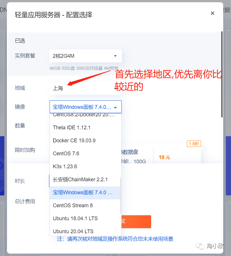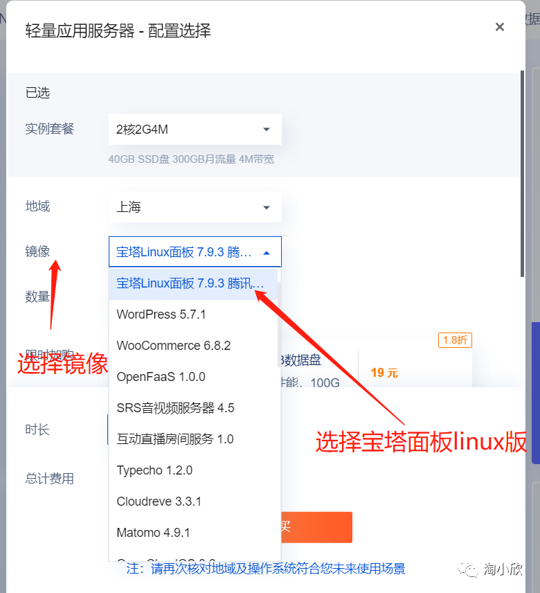然后选择镜像,选择镜像为宝塔面板linux版,最后点击立即购买.