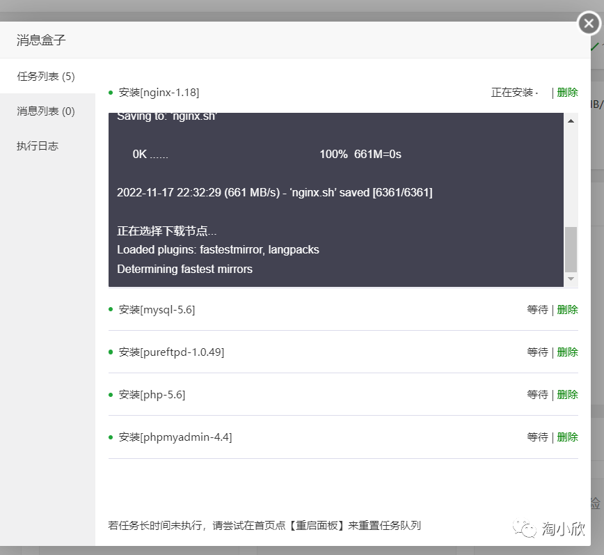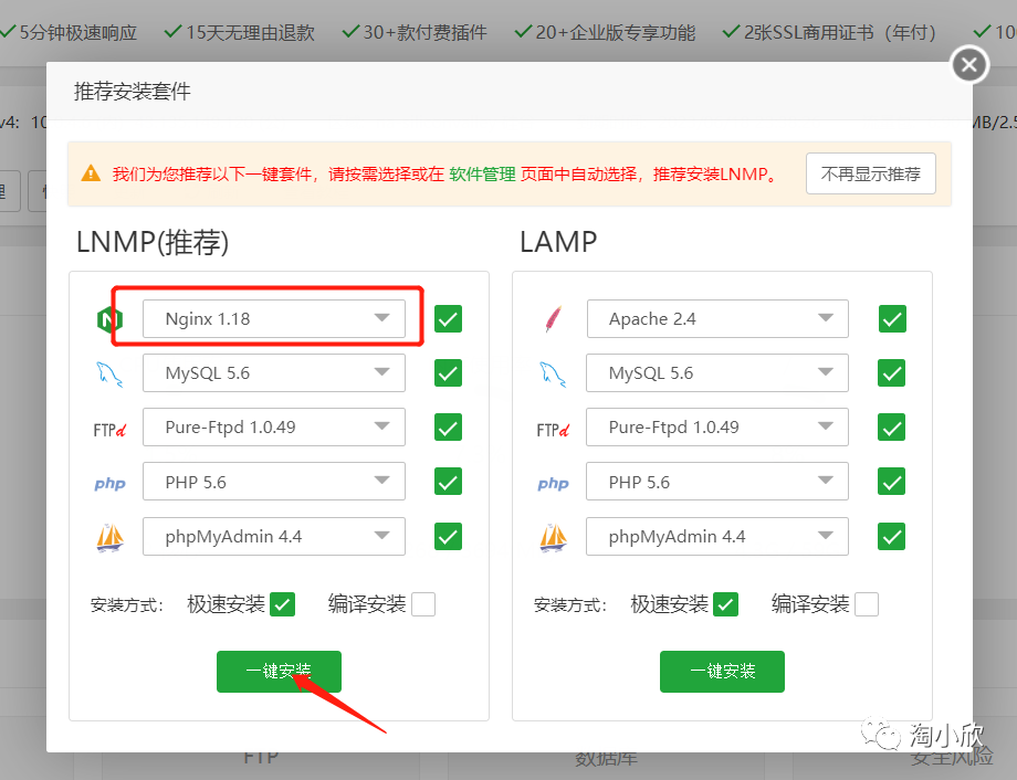 然后会弹出如图,将nginx版本切换为1.18,然后点击一键安装