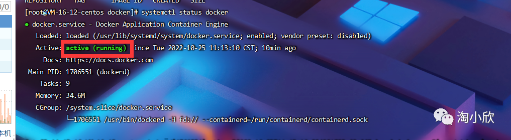 systemctl status docker当出现active(running)时,即为启动成功,如图: