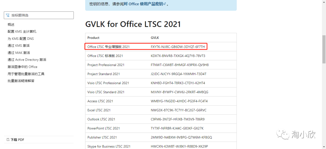 例如我用的是Office LTSC 专业增强版 2021,复制对应的GVLK即可:FXYTK-NJJ8C-GB6DW-3DYQT-6F7TH
