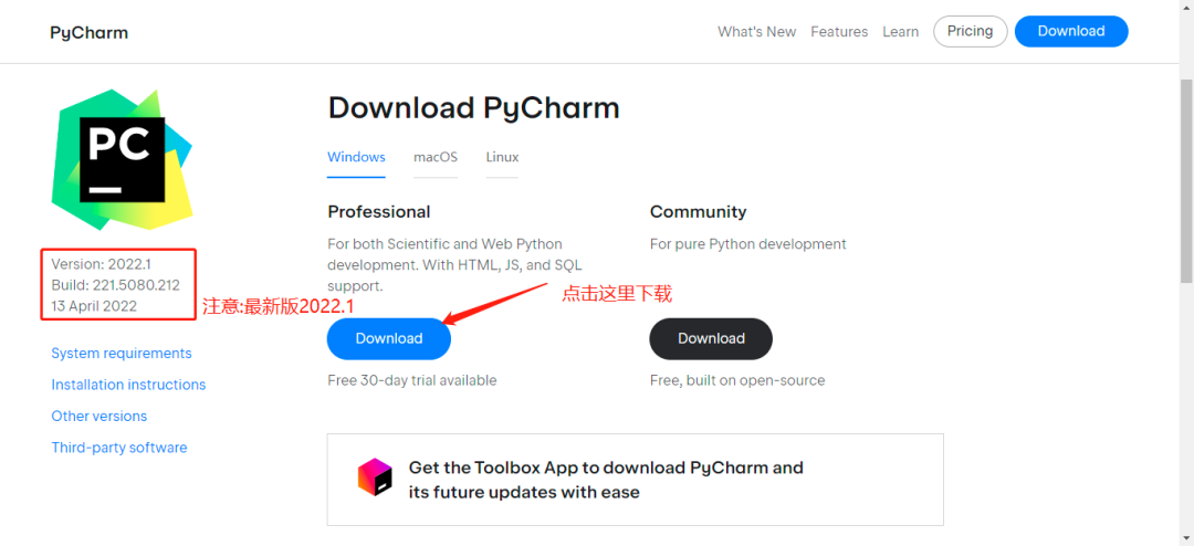 https://www.jetbrains.com/找到最新版本的pycharm,这里就以windows