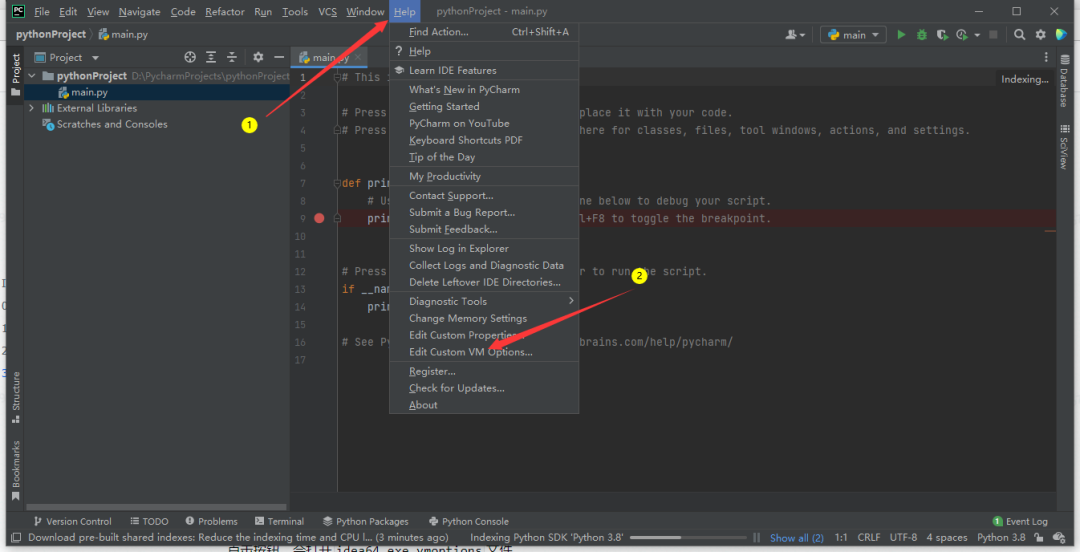 点击如图所示的菜单:Help - > Edit Custom VM Options...