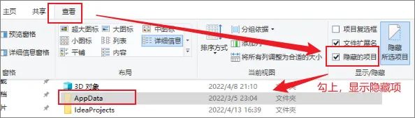 C:\Users\用户名\AppData\Roaming\JetBrains\IntelliJIdea2021.3\idea64.exe.vmoptions注:AppData目录为隐藏目录,需要手动输入,或通过以下方式显示隐藏文件夹;