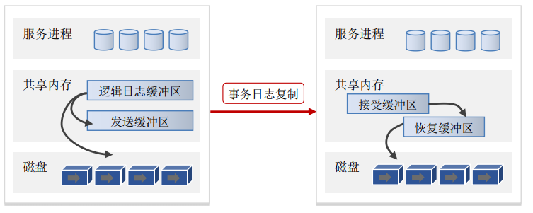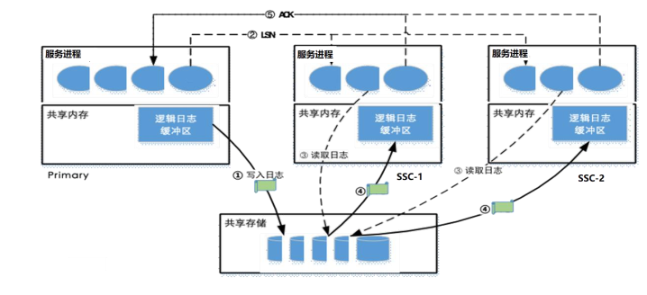 SSC( 共享存储高可用集群) 与 HAC 不同, SSC 采用共享磁盘方式, 避免了数据重复存储的问题。 工作原理是基于 LSN 在辅节点上把逻辑日志恢复到缓