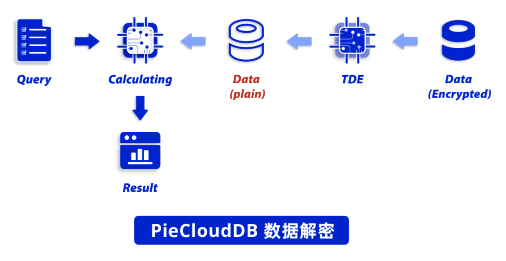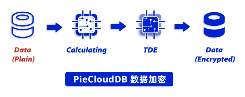 PieCloudDB 支持数据实时加密,即对数据文件执行实时I/O加密和解密,实现原生用户数据(包括表数据、辅助数据、磁盘缓存文件)的自动加解密,无需修改查询语句且性能损失小。