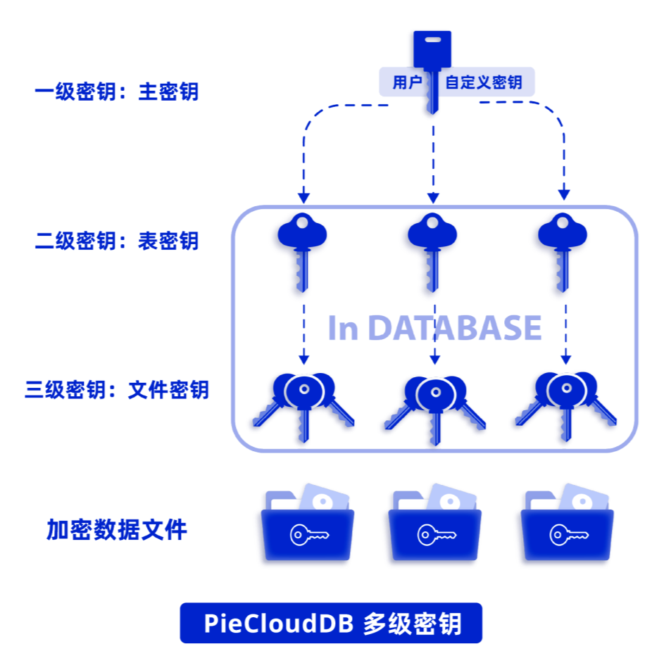 PieCloudDB使用三层密钥结构,第一级密钥为主密钥,用来加解密第二级密钥,第二级密钥为各个数据表的表密钥,用来加解密第三层密钥,第三级密钥为各个数据文件的密钥,用来加解密对应的数据文件。PieCloudDB 内每个租户数据完全隔离,拥有独立的密钥体系。三层密钥有效防范了数据泄露,确保了用户的数据安全。