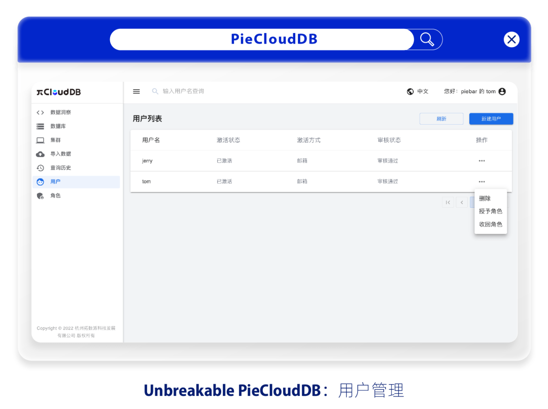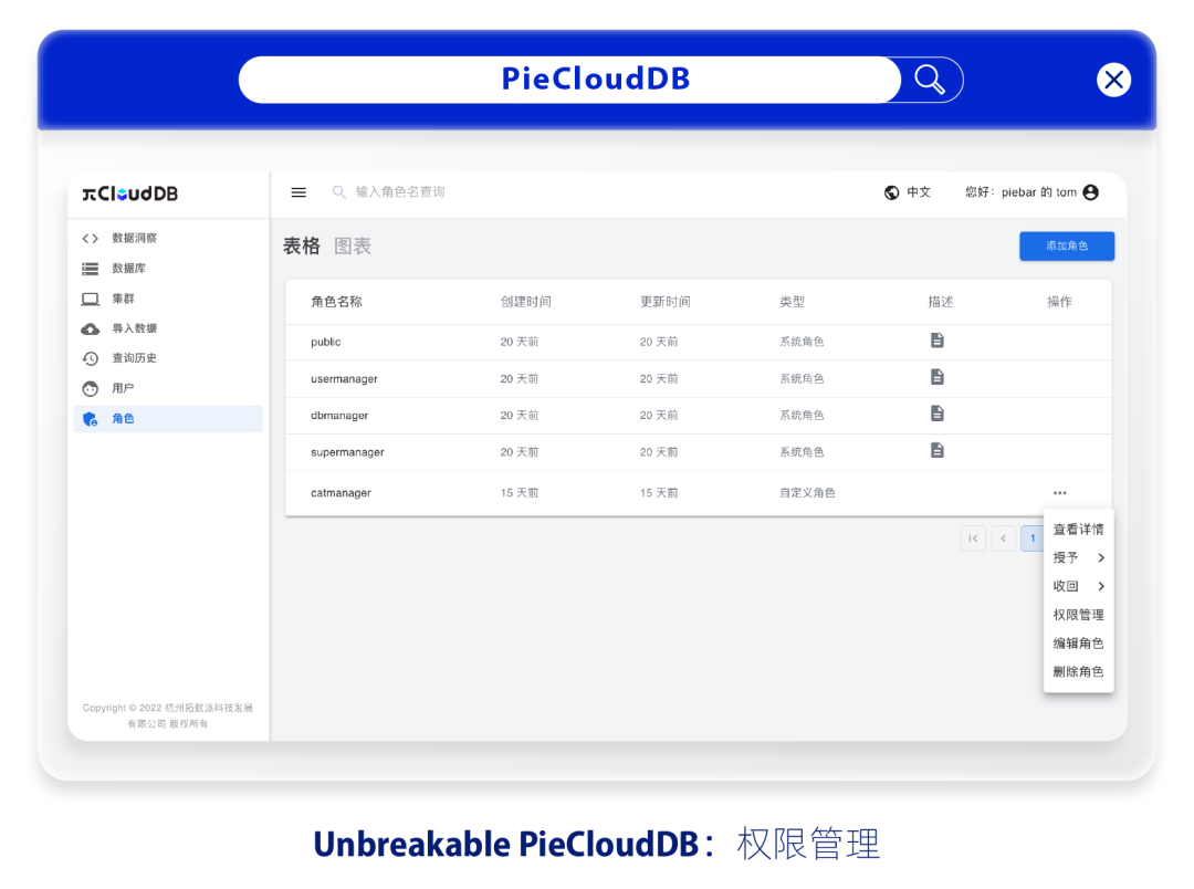 PieCloudDB 的安全技术贯穿数据库的各个方面,通过透明加密、可视化角色与权限管理、SQL标准和标准数据库接口的兼容等多种安全技术全方位保证数据安全,将数据泄露风险降至最低。