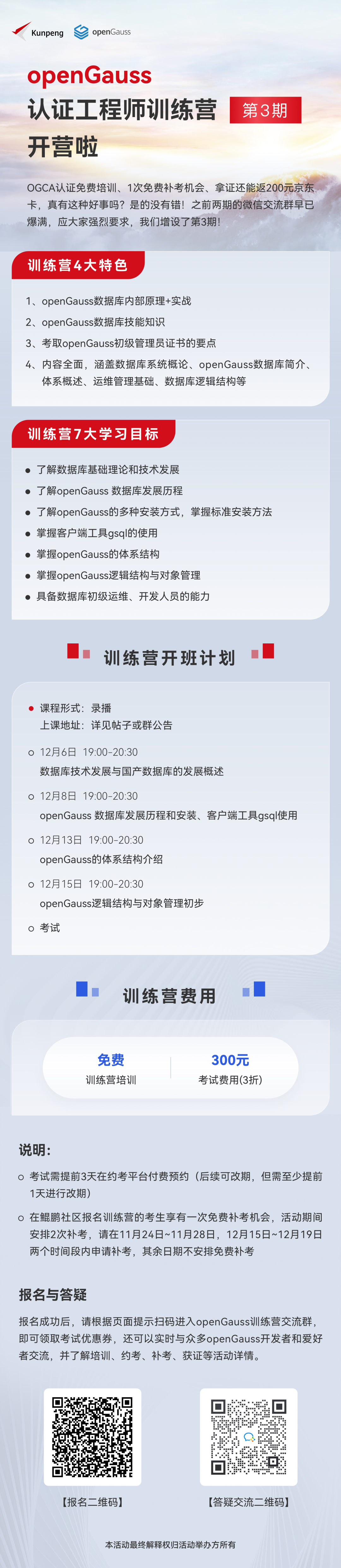 OGCA(openGauss认证工程师)考试安排在11月6/13/20/27日;12月4/11/18/25日。