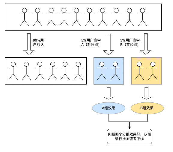 A/B 实验是互联网场景中对比策略优劣的重要手段。为了验证一个新策略的效果,需要准备原策略 A 和新策略 B 两种方案。随后在总体用户中取出一小部分,将这部分用户完全随机地分在两个组中,使两组用户在统计角度无差别。将原策略 A 和新策略 B 分别展示给不同的用户组,一段时间后,结合统计方法分析数据,得到两种策略生效后指标的变化结果,并以此判断新策略 B 是否符合预期。