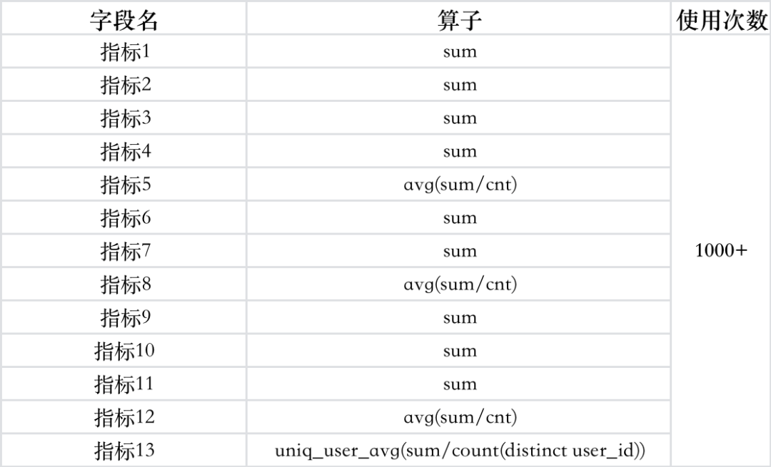 参与计算的指标也集中在部分字段,且大部分都是聚合计算(sum)或可以转化为聚合计算(avg):