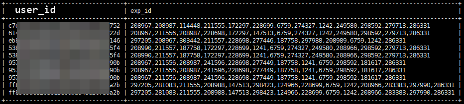 exp_id(实验组ID)在明细表中以逗号分隔的字符串进行存储,查询数据时使用 LIKE 方式匹配。作为 AB 实验报告查询的必查条件,这种查询方式无疑是低效的。