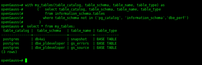 where table_schema not in ('pg_catalog', 'information_schema','dbe_perf')
