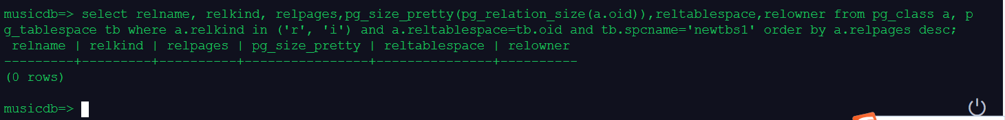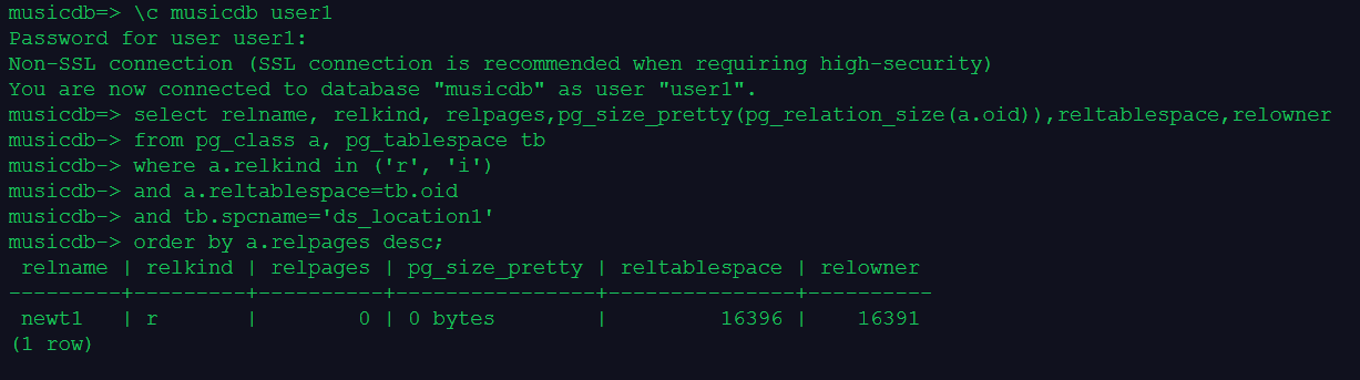 5.查看表空间newtbs1、 ds_location1上的对象:
