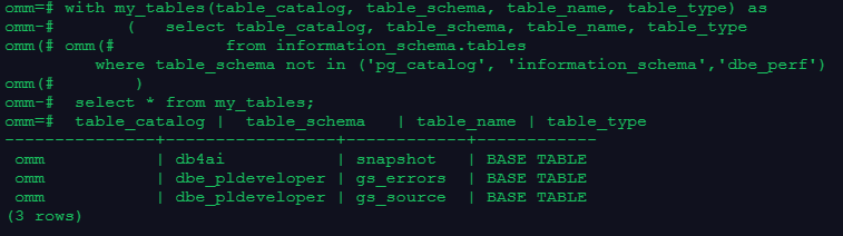 where table_schema not in ('pg_catalog', 'information_schema','dbe_perf')