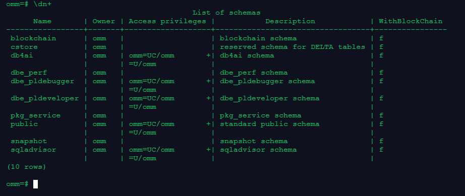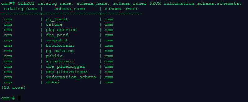 SELECT catalog_name, schema_name, schema_owner FROM information_schema.schemata;