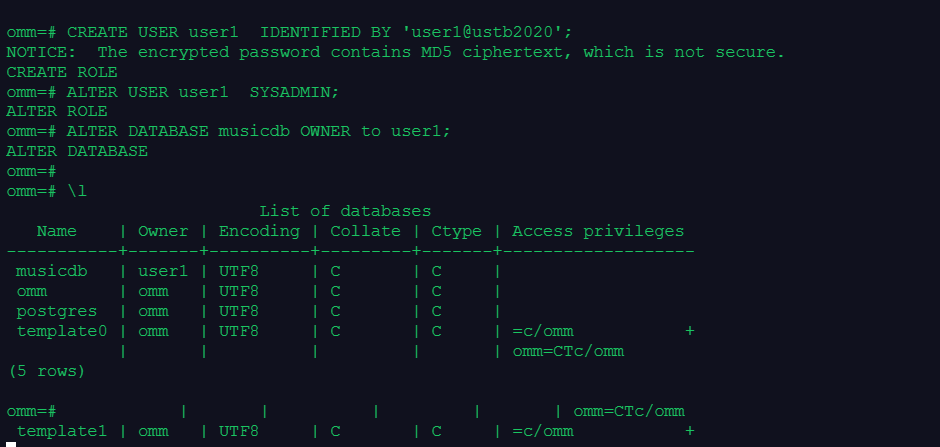 CREATE USER user1 IDENTIFIED BY 'user1@ustb2020';