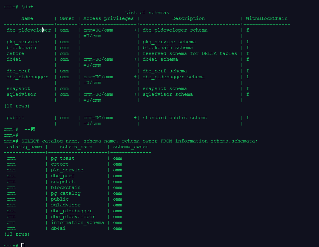 SELECT catalog_name, schema_name, schema_owner FROM information_schema.schemata;