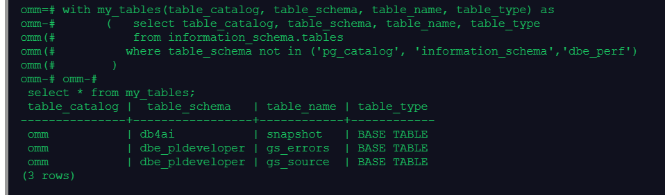 where table_schema not in ('pg_catalog', 'information_schema','dbe_perf')