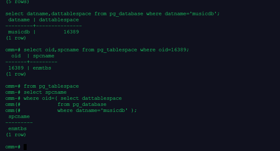 –首先执行下面的语句,查看musicdb数据库默认表空间的对象OID: