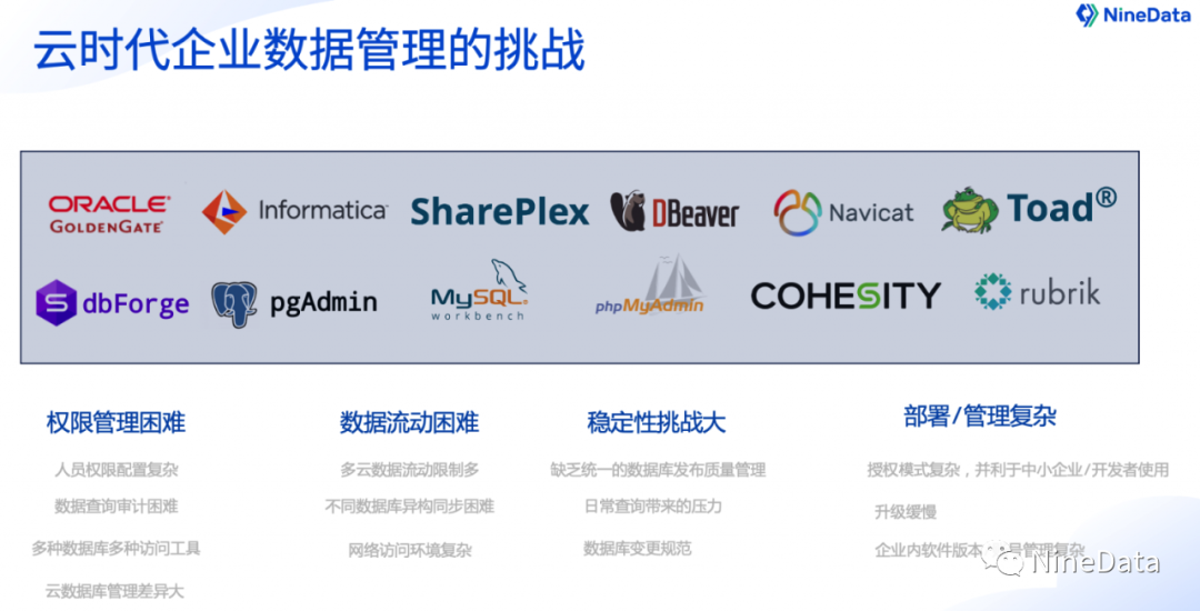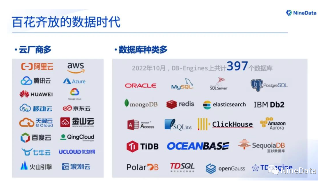 这就是NineData(www.ninedata.cloud)产生的背景和原因,NineData要做的就是在这个多云时代,在这个数据库百花齐放的时代,构建全球领先的多云数据管理平台。