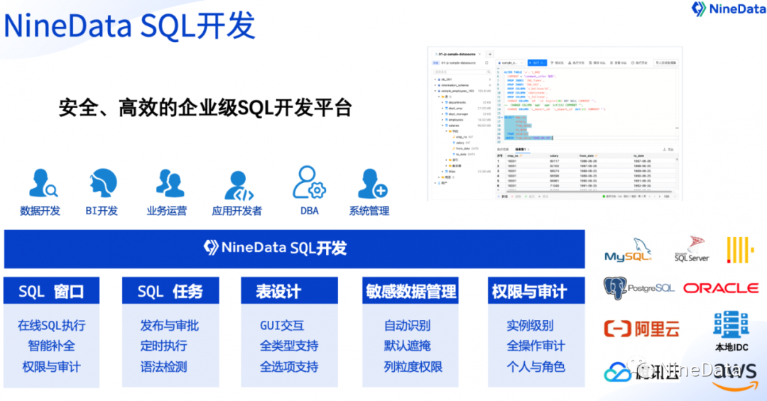 简单的概括NineData SQL开发产品的常见使用场景如下。第一,在日常的业务开发中,用它去做SQL查询与开发。第二,生产数据的直接查询。另外,可以使用该功能去做生产变更的发布。NineData支持完整的权限管理、审计日志以及敏感数据保护等能力,可以非常好的保护企业的数据安全。