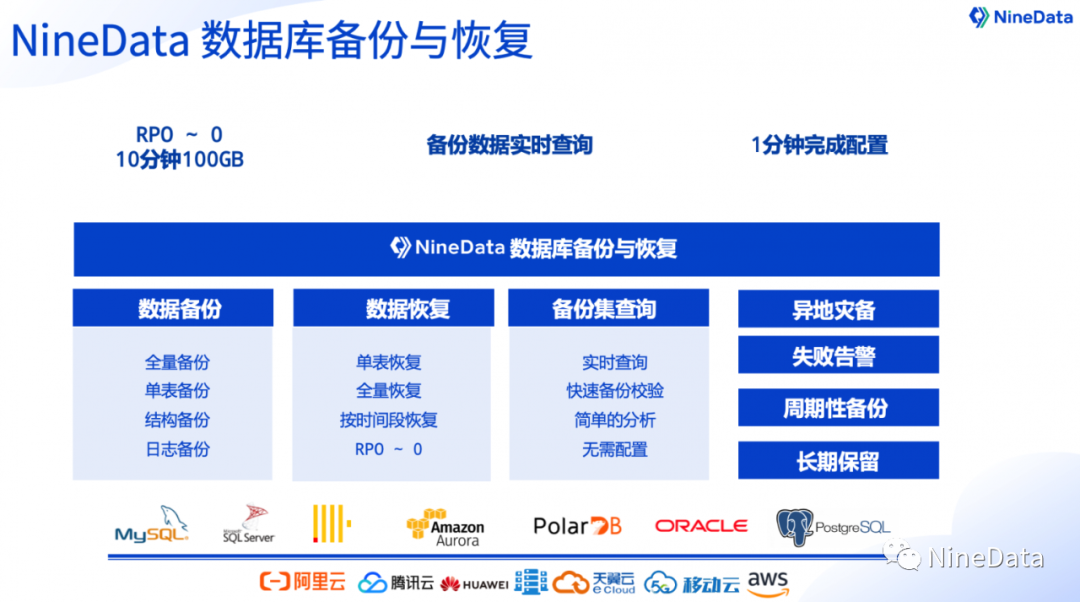 我们看一下NineData如何解决这些问题。首先,它的配置非常简单,是一个SaaS化的服务,一分钟就可以完成整个的备份任务配置。第二,它可以达到RPO几乎等于零的效果。另外,它的备份性能也会非常高,10分钟可以完成100GB备份,可以满足绝大多数线上备份的诉求。另外我们还提供了超越业界所有的产品,并且非常实用的功能,就是对数据备份的实时查询。也就是说,在备份完成后,就立刻可以查询到备份中的数据,不需要去做恢复。这样就可以很好的去验证备份的有效性。第二,当数据发生故障的时候,也不需要花费非常长的时间,先去做数据恢复,就可以直接对历史的数据进行查询和恢复。