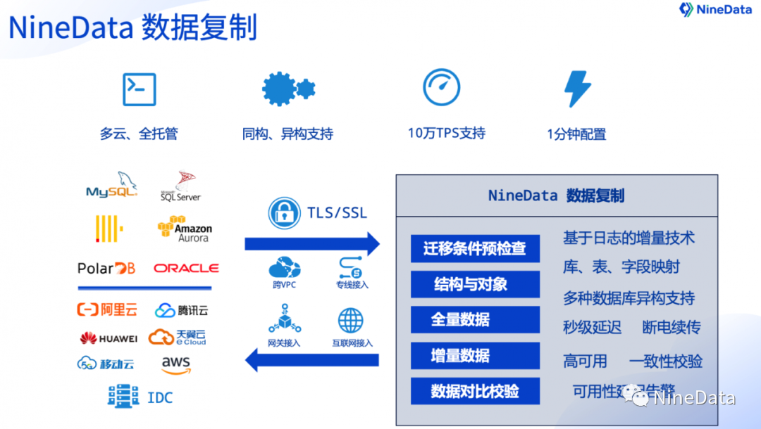 NineData的数据复制产品,它是一个多云全托管的服务,支持阿里云、腾讯云等国内外主流的云厂商。另外,这是一个全托管服务,只需做一些简单的配置,就能拥有一个非常好的、长期稳定运行的数据复制链路。NineData同时支持同构和异构复制,不管是MySQL到MySQL,还是MySQL到可ClickHouse,都可以支持的非常好。另外,它的性能也非常好,TPS可以支持到10万,可以满足企业绝大多数在线的数据复制诉求。下面这个架构图,就是数据复制所具备的主要的产品能力,包括迁移时预检查、结构和对象迁移,全量数据迁移,增量数据迁移,以及在整个数据完成复制之后,支持对两端数据的对比和校验。