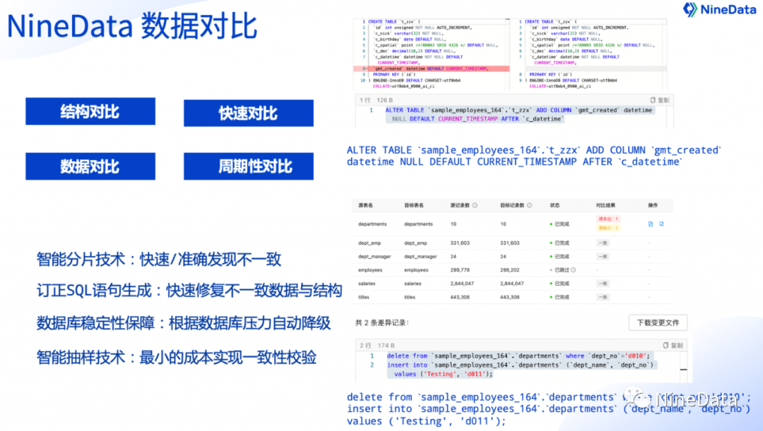 这些场景都可以使用”NineData数据对比”去解。它有几个大的功能模块,包括结构对比、全数据量对比,另外它可以支持快速对比和周期性对比等。