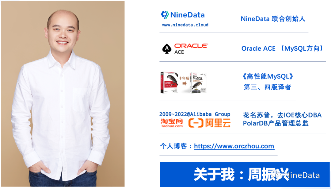 周振兴,是NineData的联合创始人,致力于解决云时代的数据管理挑战。周振兴是数据库领域的一名老兵了,是Oracle ACE(MySQL方向),也是《高性能MySQL》第三、四版的译者。2009年,加入了阿里数据库团队,在这个团队供职12年,是阿里数据库架构演进的核心人员,从早期的去IOE,再到全面分布式支持历届的双十一。之后,则在阿里云上将集团的数据库技术全面云化,服务更多云端客户。