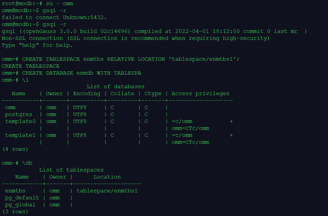 --执行下面的gsql元命令\db,查看openGauss数据库集群上有哪些表空间: