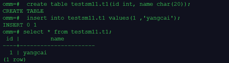 4.在模式testsm1中建表t1、插入记录和查询记录