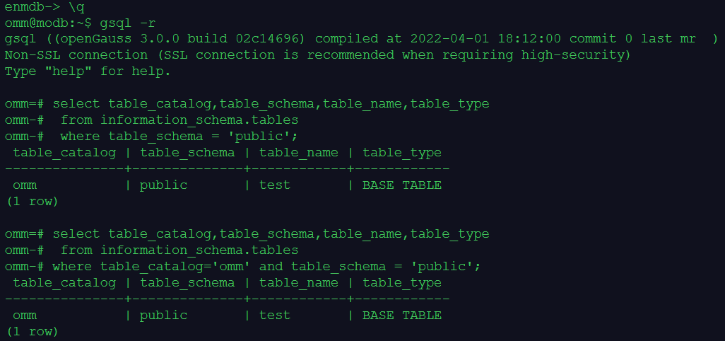 where table_catalog='omm' and table_schema = 'public';