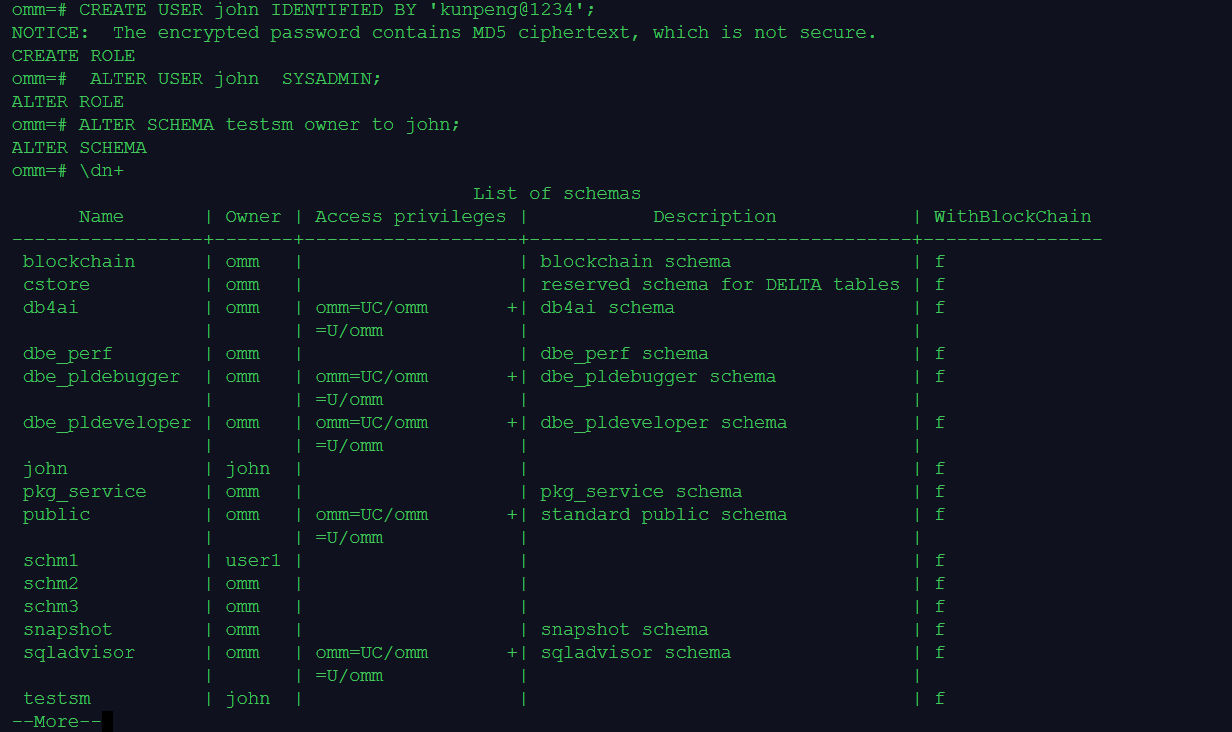 2.创建一个用户john, 并将testsm的owner修改为john,且修改owner前后分别使用\dn+查看模式信息