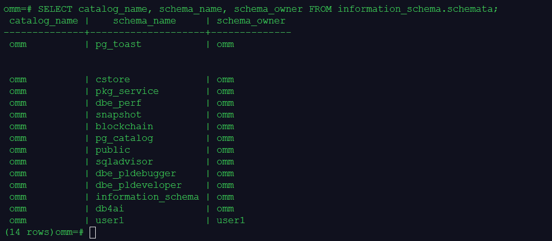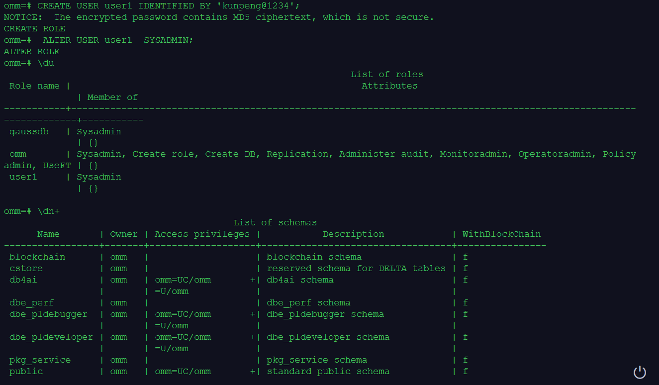 --创建数据库用户user1的同时,会在系统的omm数据库中创建一个与这个用户名同名的模式user1。