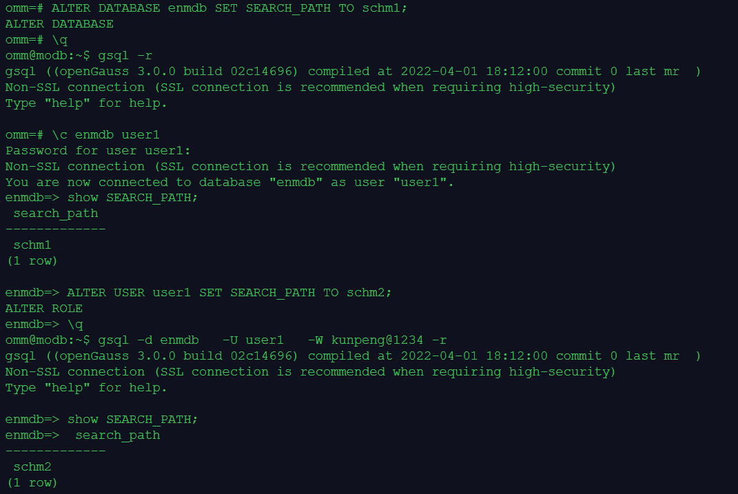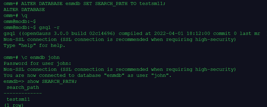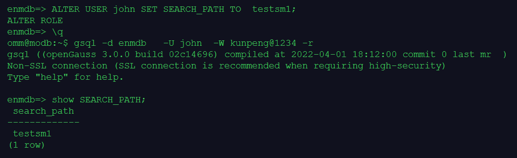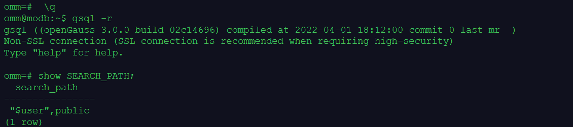 在gsql客户端会话中,执行命令SET SEARCH_PATH TO schm1可以修改模式搜索路径,但只在gsql客户端会话的持续过程中起作用,一旦退出gsql客户端会话,这个设置就丢失了。重新登录gsql会话将模式搜索路径恢复为默认值"$user",public。