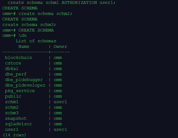 --创建一个模式schm1,属主是用户user1,并再次查看当前连接的数据库下有哪些模式: