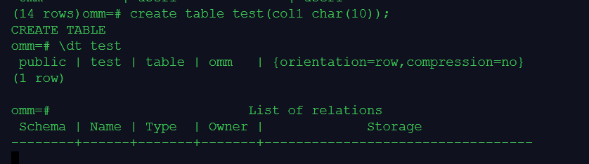 --执行下面的gsql元命令\dt,查看 test表的Schema: