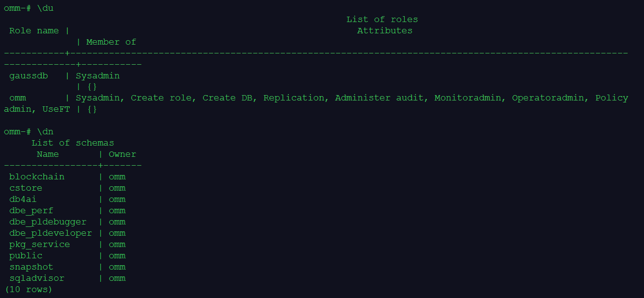 2.执行下面的gsql元命令,查看openGauss数据库上有哪些用户和模式