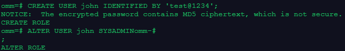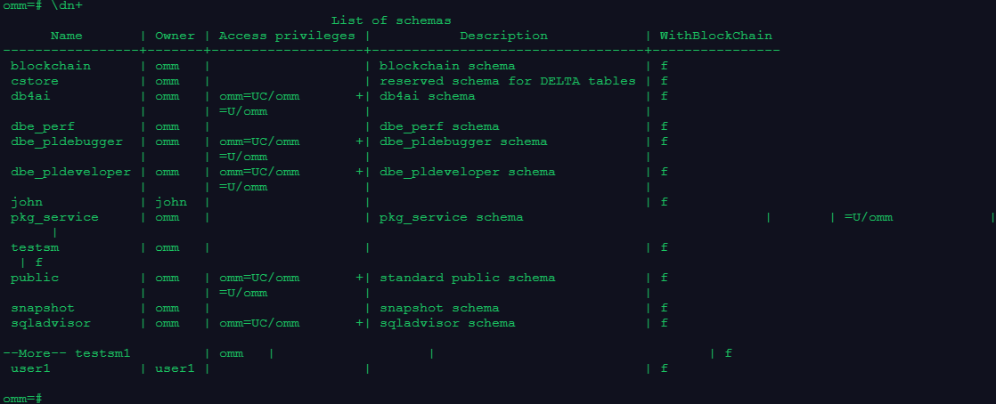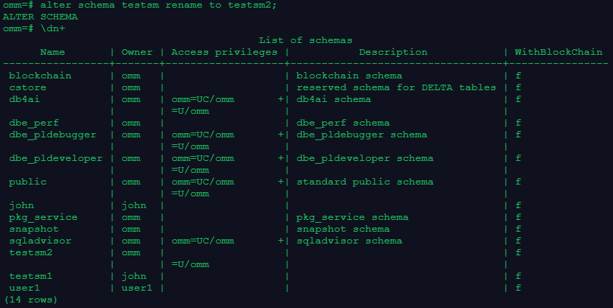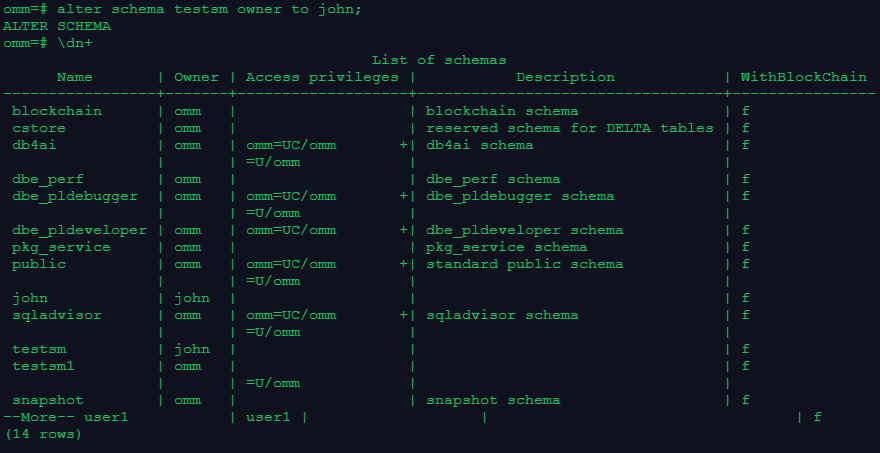 2.创建一个用户john, 并将testsm的owner修改为john,且修改owner前后分别使用\dn+查看模式信息;